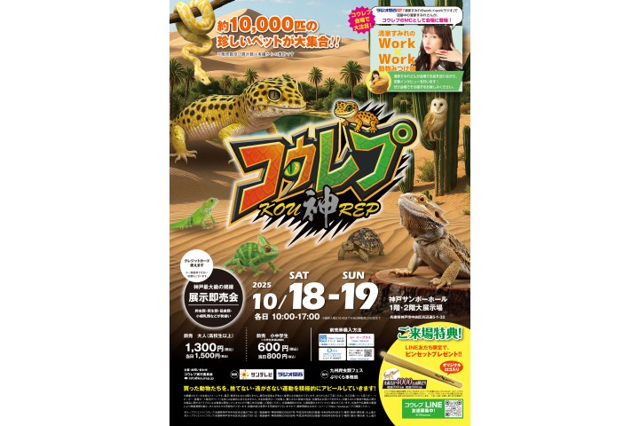 当イベントは、爬虫類(レオパやフトアゴヒゲトカゲ、ボールパイソン、リクガメやカメレオン)をはじめ、 カエルなどの両生類、タカやフクロウといった猛禽類、 さらにはウサギやフクロモモンガ、サルなどの小動物まで「見て」「触れて」「知って」「迎えられる」体験型の展示即売イベントとなっております。