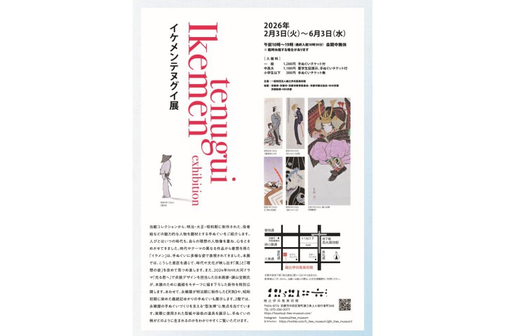 細辻伊兵衛美術館コレクションから、明治・大正・昭和期に制作された、役者絵等の魅力的な人物を題材とする手ぬぐいをご紹介します。人びとはいつの時代も、自らの理想の人物像を重ね、心をときめかせてきました。時代やテーマの異なる作品から着想を得た「イケメン」は、手ぬぐいに多様な姿で表現されてきました。本展では、こうした意匠を通じて、時代や文化が映し出す「美」と「理想の姿」を改めて見つめ直します。